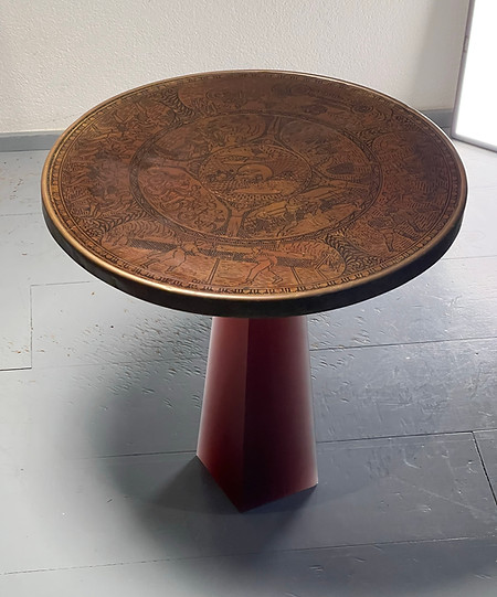 ​This brass top, with its Olympic sports motifs, recalls a time when furniture carried stories. We transformed the vintage brass top by preserving it in resin and combining it with a rich, semi-transparent resin base, giving it a contemporary, light-shifting presence.